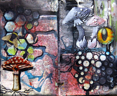 Black gesso, modelling paste, stencils.